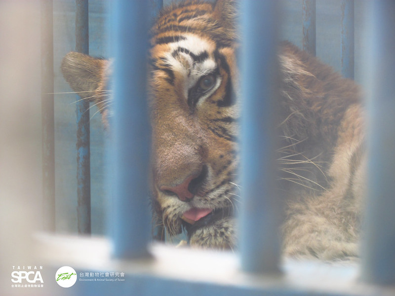 台南世界蛇王教育農場內飼養的老虎,長期被囚禁在單調、無任何豐富化設施的狹小籠內,老虎出現無精打采、靜止不動,同樣為野生動物遭不當飼養後,因沮喪、挫折產生的異常行為。