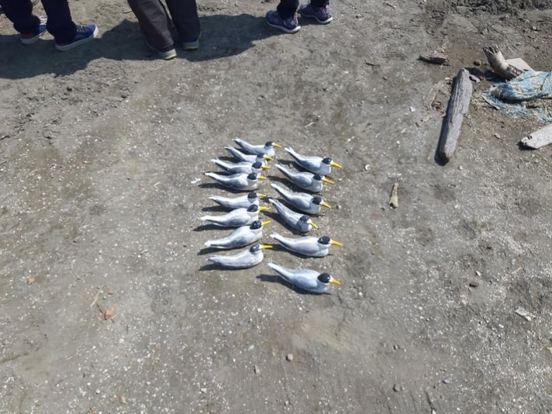 桃市野鳥學會榮譽理事長吳豫州說,這些假鳥是利用水泥灌模成形,再塗上白色額頭、黃色鳥嘴及黑白羽色,搭配假的蛋,利用小燕鷗喜好群聚特性,飛抵時以為已有同伴在此築巢而跟進。