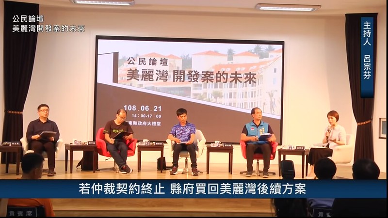 「公民論壇─美麗灣開發案的未來」邀副縣長張志明、在地人士從事護漁保育的生態志工陳世岳、台東大學教師柯志昌、地球公民基金會蔡中嶽4人擔任與談人,台東縣長饒慶鈴全程在場。